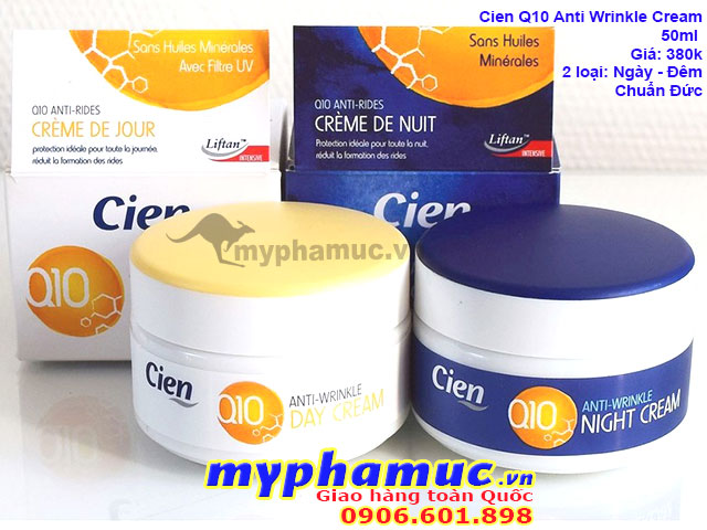 Kem dưỡng da Cien Q10 Anti Wrinkle Day Cream dưỡng da ban ngày. Giúp làm mờ nếp nhăn, đồng thời chống nắng và bảo vệ da trước các tác động của ánh mặt trời. Giải pháp cho: da khô, da có nếp nhăn, da lão hóa.