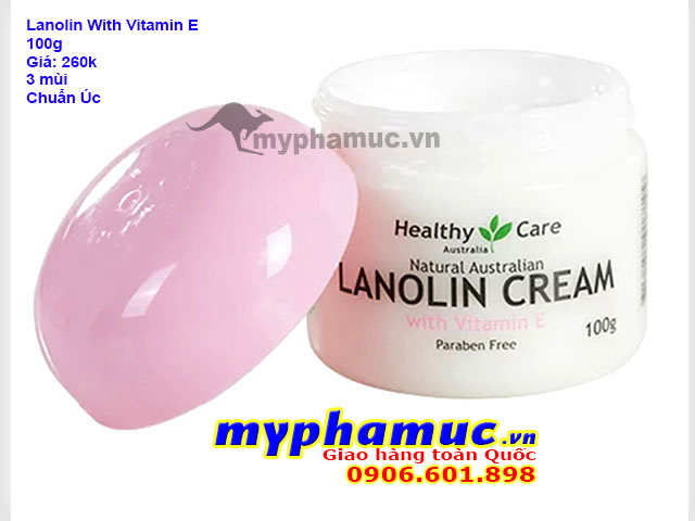 Kem dưỡng da cừu Healthy Care Lanolin Cream with Vitamin E với thành phần chủ yếu chiết xuất từ mỡ cừu, tinh chất Vitamin E tự nhiên sẽ giúp cho làn da giảm các nếp nhăn, chân chim, sẹo, các vết nám và tàn nhang, chất hydro không bão hòa thấm sâu vào da và giải độc tố cho da và chống lão hóa cho da.
